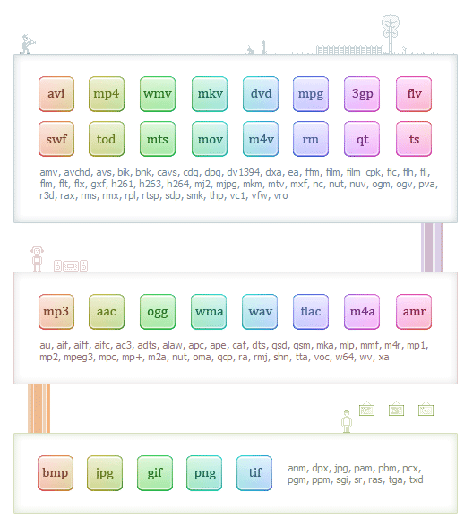 Freemake Video Converter accepte des vidéos d'entrée en AVI, MP4, MKV, WMV, MOV, 3GP, 3G2, SWF, FLV, TSD, AVCHD, MOV, DV, RM, QT, TS, MTS, et bien plus encore. Importez de la musique (MP3, AAC, WMA, WAV), et des photos (JPG, BMP, PNG, GIF) pour les transformer en vidéo.
