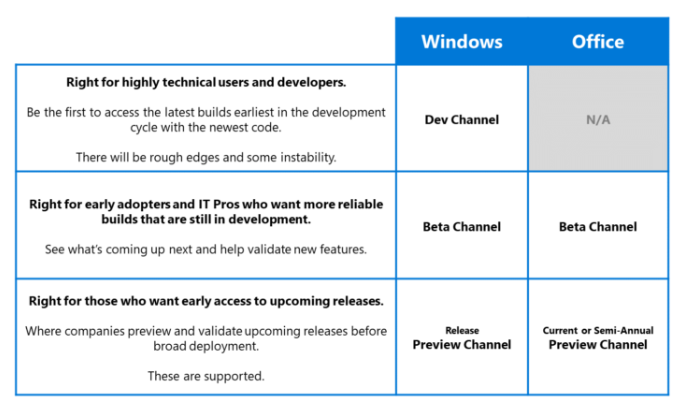 Nous sommes extrêmement heureux de nous aligner sur Office, où de nouveaux noms de chaînes ont récemment été annoncés . Un Insider peut faire un choix quant à l'expérience qu'il souhaite et faire en sorte que cela signifie la même chose entre Windows et Office. Les Insiders doivent toujours participer séparément à chaque programme d’Insiders, mais nous cherchons à améliorer cette expérience au fil du temps.