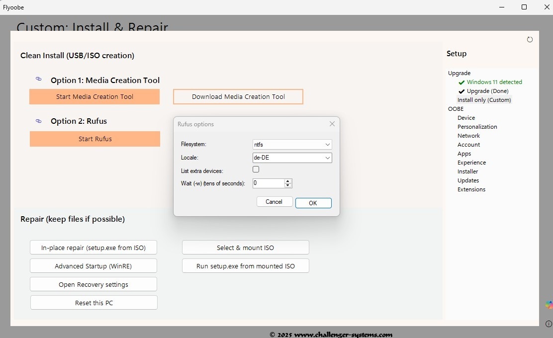 - Nouvelles fenêtres « OOBE » pour les installations et réparations personnalisées de Windows 11. Actuellement déployé en version préliminaire avec prise en charge de MCT et Rufus (interface de ligne de commande limitée, pas encore d'automatisation stable). Nous étudions encore l'ajout d'une solution native, similaire aux toutes premières versions de Flyby11, et nous attendons les prochaines versions pour le moment. Flyoobe couvre déjà l'ensemble du spectre : mises à niveau, nouvelles installations et expérience clé en main complète.